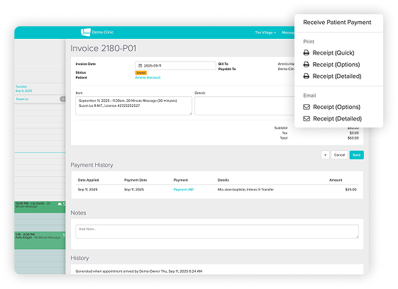 Flexible billing for all your services and products. Easily invoice, take & record payments, and provide receipts— for everything from single sessions to packages, memberships, gift cards, and product sales.