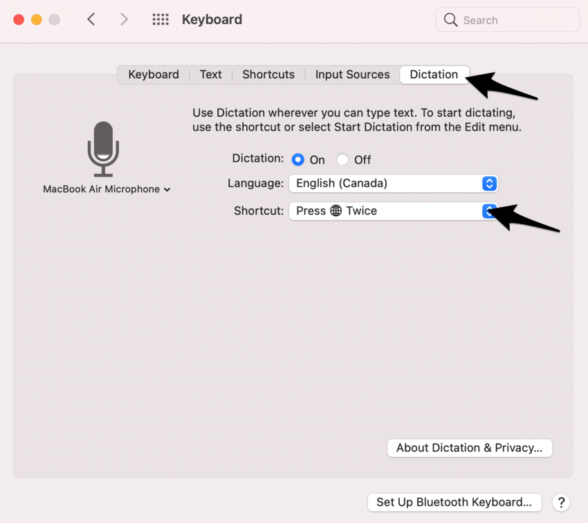 On Macs, we typically find that tapping the “fn” key twice enables dictation. And if that doesn’t work, you can also try hitting the “ctrl” key twice– that’s a popular setting too. But it is best to take a quick peek into your system preferences to be sure. 😉