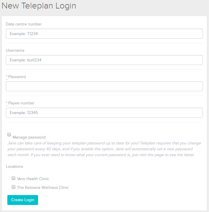 If you click the Manage Password checkbox, Jane will auto-update your password every 40 days when Teleplan prompts for a new one, instead of requiring you to manually update it each month.
