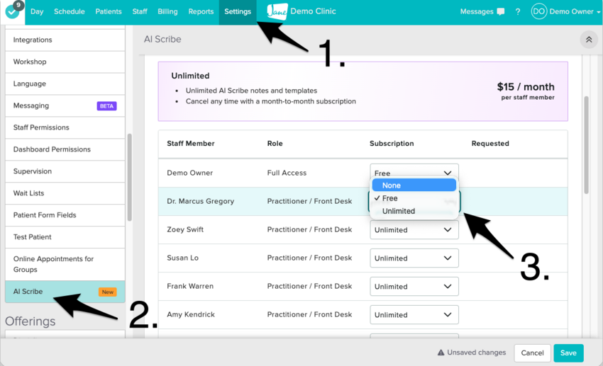 - Unlimited: Unlimited Access to AI Scribe for $15 per month per practitioner