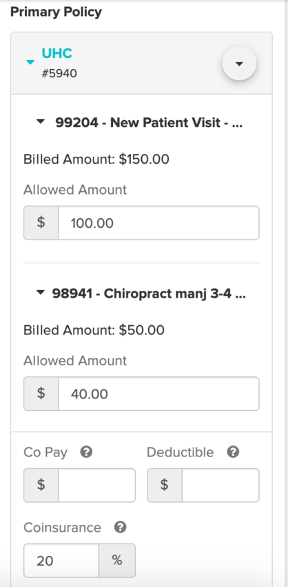 Let’s say we’re billing out two billing codes - $150 and $50 - to our UHC insurer. We know that UHC will allow $100 for our first code and $40 for our second code. We also know that our client has a 20% Coinsurance.