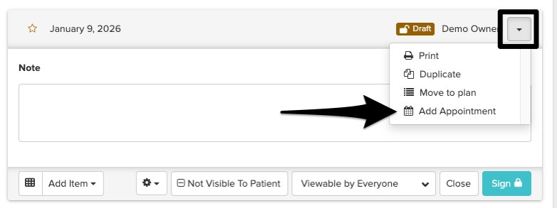 If you’ve forgotten to chart from your day sheet, no problem! Click the arrow on the upper-right of the entry and select Add Appointment from the menu.