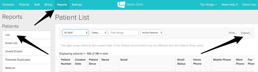 This is accessible by those with the Account Owner or a staff member with Full Access. The Patient List can be exported to Excel from the Reports tab. The report can be filtered by a single practitioner to provide just clients seen by a certain practitioner.