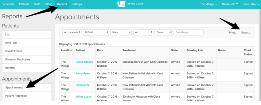 Appointments can be exported from this same Reports area. This can be filtered in the same way down to a single practitioner and a date range to include past and future appointments if appropriate.