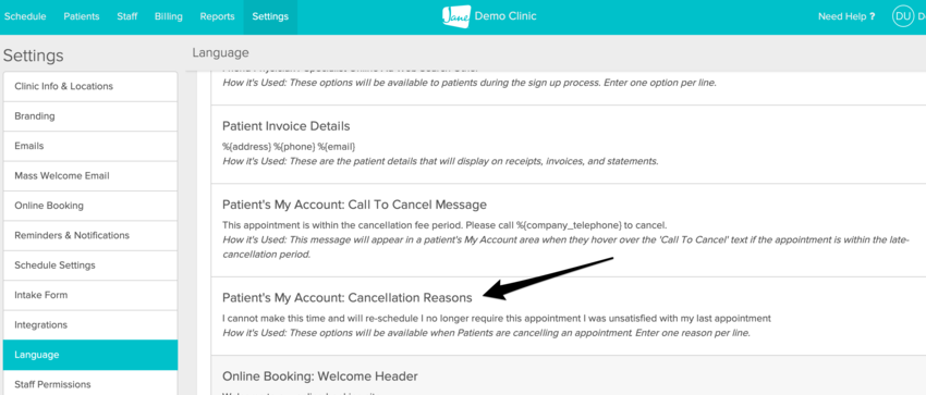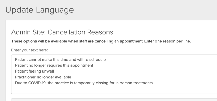 While you’re editing those, you may also wish to edit the ones on the patient side too, ‘Patient’s My Account: Cancellation Reasons’.