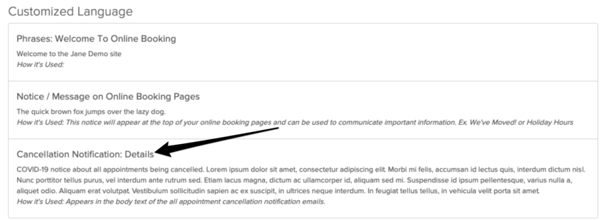 This language can be edited in the same Settings - Language area under the Cancellation Notification: Details area.