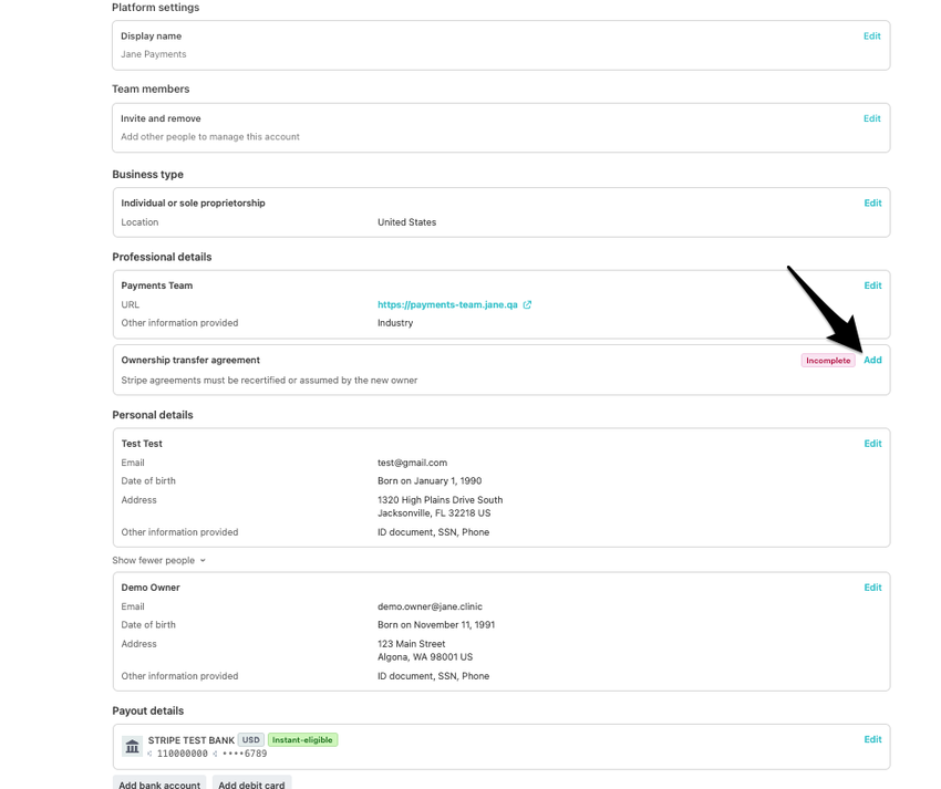 In Jane, go to Settings → Jane Payments → Pencil icon → Go to Stripe.