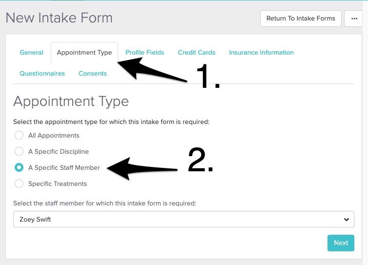 If the intake form’s Appointment Type is not set to a specific staff member, the questionnaire will be visible to all staff.