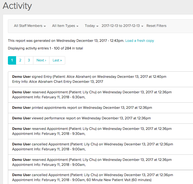 For the most part, charting regulations across industries are fairly clear in stating that electronic health records management systems must have an “audit trail” that tracks who made the change and when. Jane, therefore, always keeps track of who is doing what inside your account. To access this information, the Full Access user will go to “Reports” and scroll all the way to the bottom to “Activity Log”: