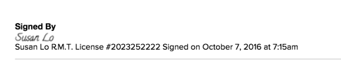 Most regulating bodies require that clinical records are chronological and include the date of entry. Accordingly, Jane adds a timestamp just before any chart is signed and locked. Jane records practitioner name, month, day year, and time: