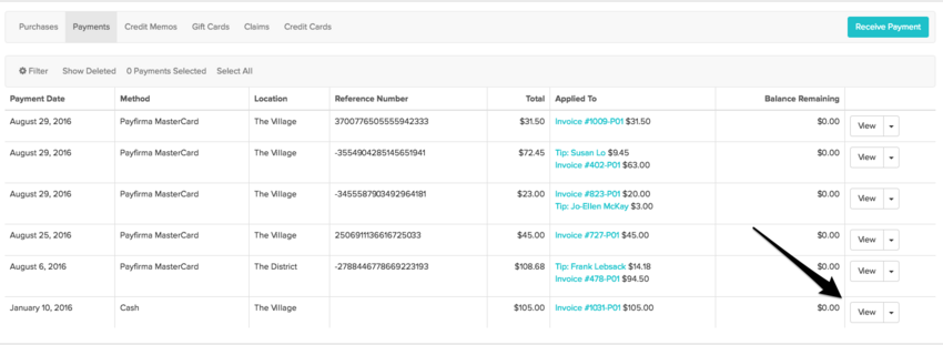 Within Billing, you can head to the Payments tab to find the payment line you want to delete, then click View.