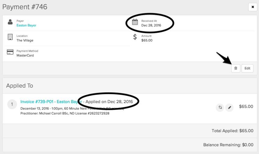 On the Payment panel that pops up, hit the trash can icon to delete the payment. As long as the Received At date and the Applied To date are today’s date, then the payment will be deleted and it’s like it never happened.