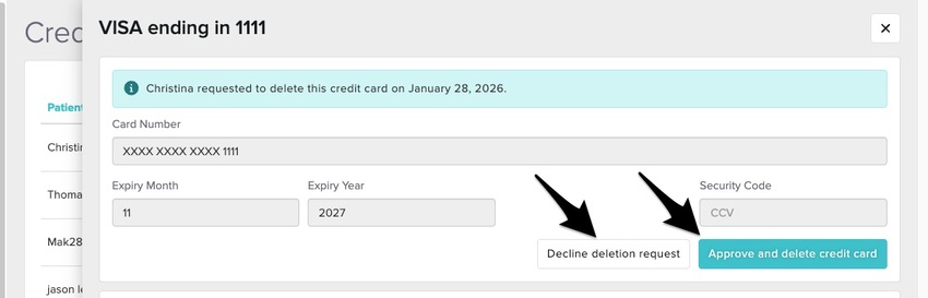 Note: Removing a patient’s credit card administratively can only be actioned by the Account Owner, Full Access or Administrative user.