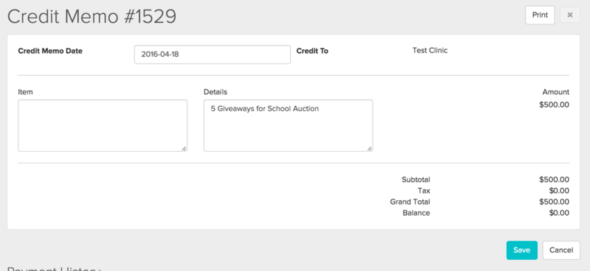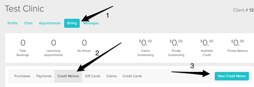 Then load up the clinic profile with as much credit as you’d like to transfer onto the cards. For example if you’re giving away 5 gift cards at $100 each then you could create a credit memo for $500.