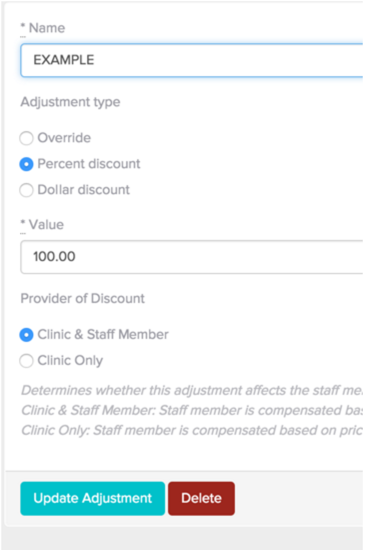 You would have this adjustment at 100% discount called something identifiable and then set to Provided by Clinic & Staff Member.