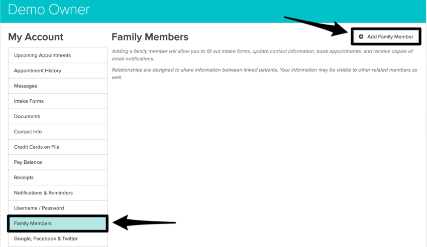 Clients can head to their My Account (Patient Portal), select Family Members from the menu on the left, and click Add Family Member.