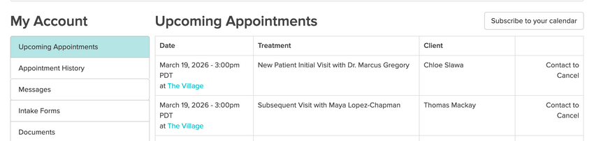 Once a patient completes the booking flow, the appointment is created on the family member’s profile. The patient can view all family appointments (upcoming and past) in the Upcoming Appointments and Appointment History tabs of their My Account area.