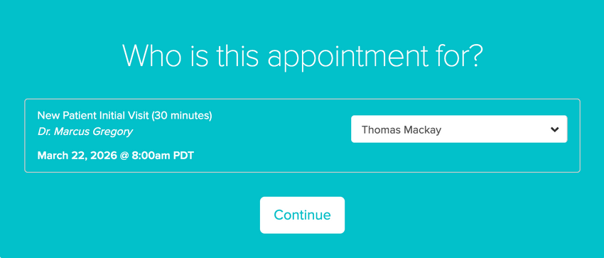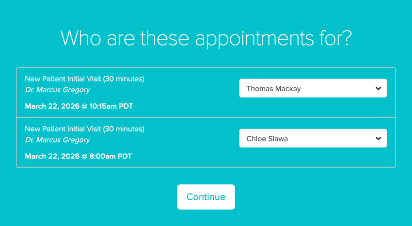Once the setting is enabled and a Patient Relationship is in place, patients will see a family booking option when booking online.