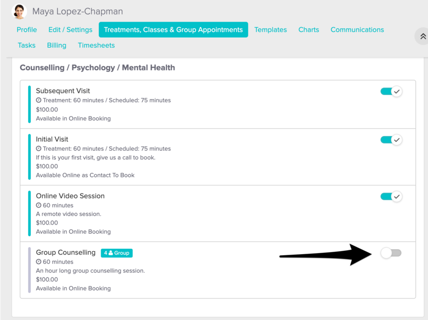 Last step! You’ll need to toggle this treatment back on for each staff member who offers it. Head to their staff profile and select their Treatments tab.