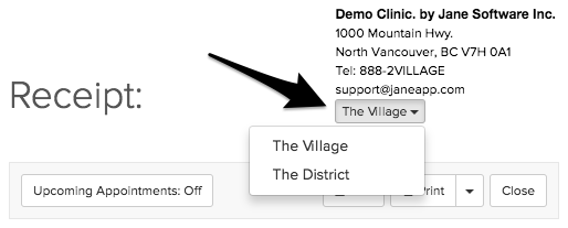 In the print preview in Jane, click on the location name drop-down menu on the top right corner to select a new location name and address to print on the financial document: