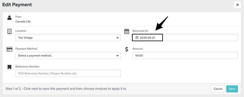 📣 Heads up: If the insurer payment was made by credit card through Jane Payments, the Received At date cannot be edited. The date is locked to match the actual charge date on the bank statement.