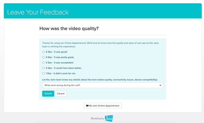 Once you leave the call, you’ll have an opportunity to share your feedback about the video call with the Jane team as we look to continue refining the experience.