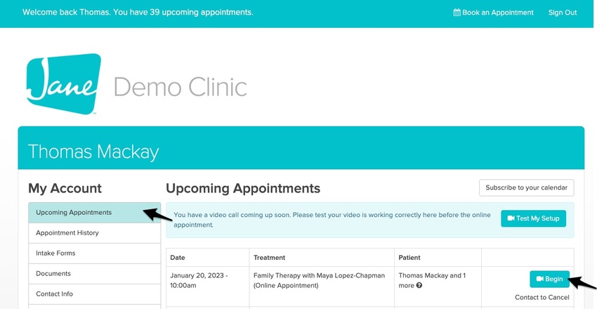 Once you have logged into your account, you will want to navigate to the Upcoming Appointments tab on the left-hand side, then click the blue Begin button next to today’s appointment.