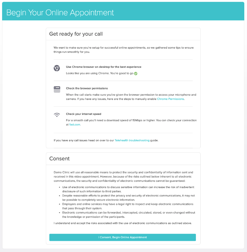 Jane and the clinic will need your consent before your video call begins. To provide it, click the I Consent, Begin Online Appointment button.