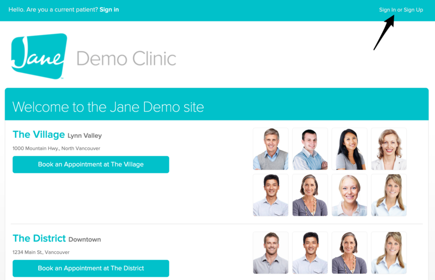 Alternatively, you can access this same button by logging into your account by visiting your clinic’s Jane site and using the Sign In/Sign Up button in the top right-hand corner.