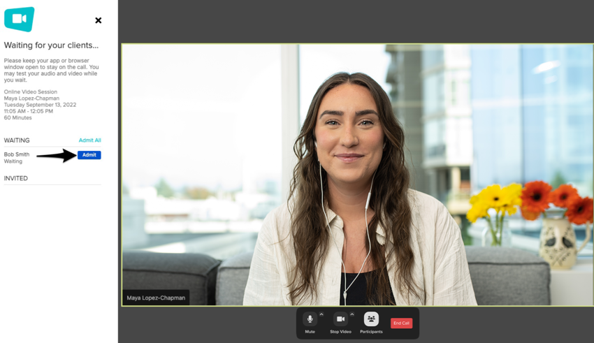 If your clients have already joined the call when you click Begin, you’ll be able to hit Admit when you are ready to start the call. If you join the call before your clients, you’ll hear a chime 🔔 once they have joined, and the Admit button will turn blue.