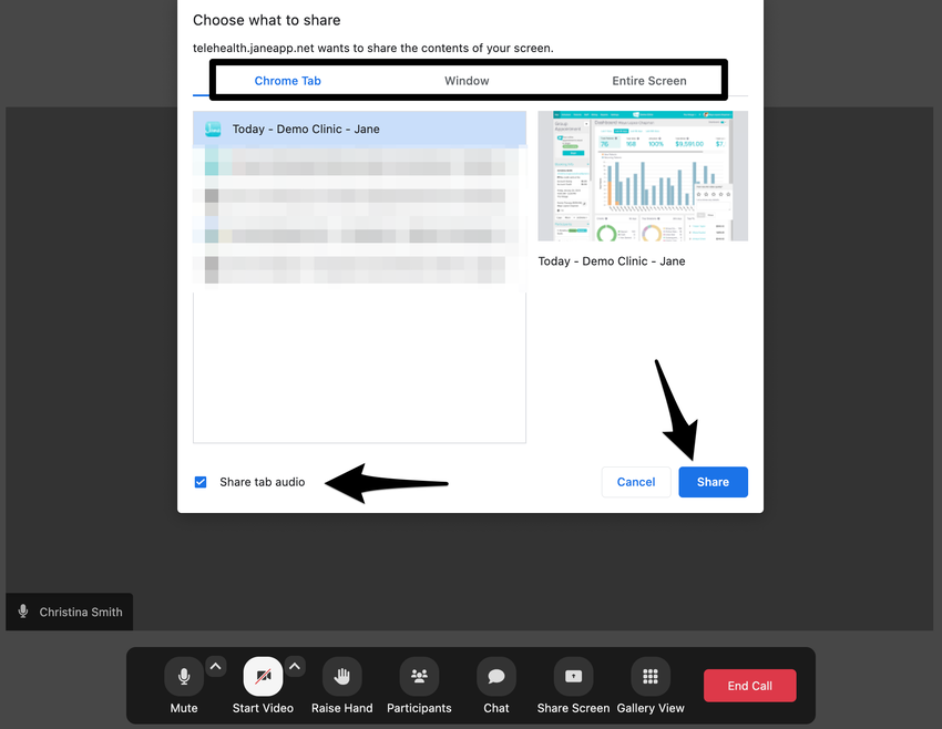 - After clicking the Share Screen button, a pop-up will open where you can choose whether you’d like to share a tab or a window you have open in your web browser, or your entire screen.