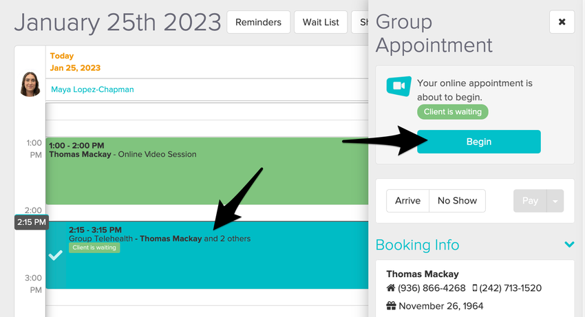 If your client has entered the appointment before you, there will be a green badge on the appointment that says ‘Client is Waiting’.