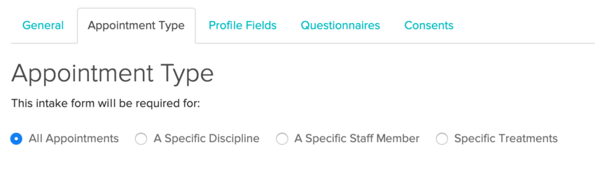 You can see here that the form is named as a general intake and to be automatically sent before the patient’s first visit. To set this to be assigned to all disciplines, practitioners, and treatments, you can leave the default selection of All Appointments in the Appointment Type tab.