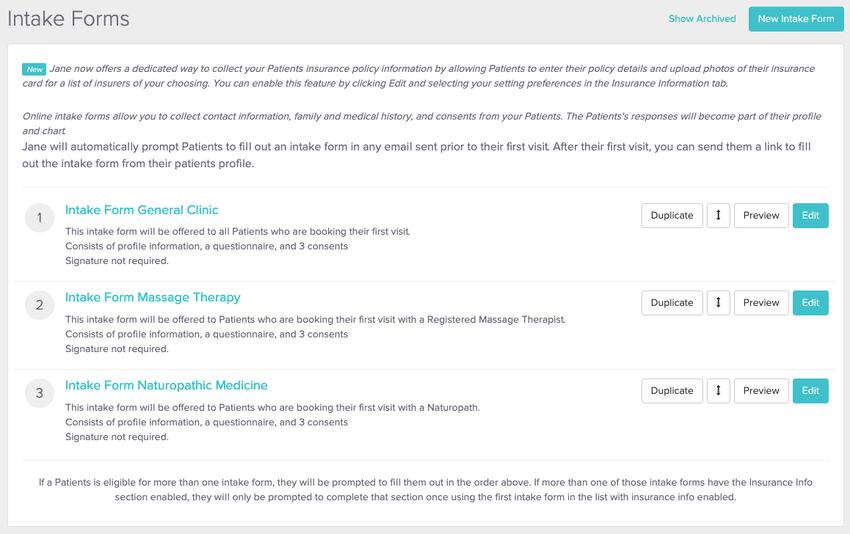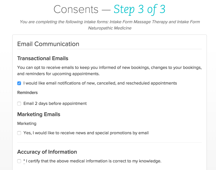 For all of Jane’s consents your patient will never have to enter duplicate information. If Jane is sending more than one intake form (in the example above someone booking in for Naturopathic Medicine would receive both the General Intake and the Naturopathic Intake) all of the demographic information will be shared, or if already entered, pre-populated.