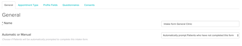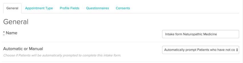 This can be an additional intake form(s) that is set to be sent out when a patient books in just for that discipline (or practitioner). So here’s how the General Tab for this consent might look: