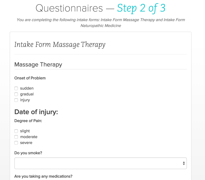 You can see that this patient needs to fill out the Naturopathic Intake and the Massage Intake. This means that they have both an initial Massage and Naturopathic visit coming up. The General Clinic form may have been completed for a previous visit so it is not listed).