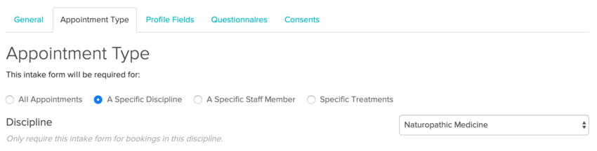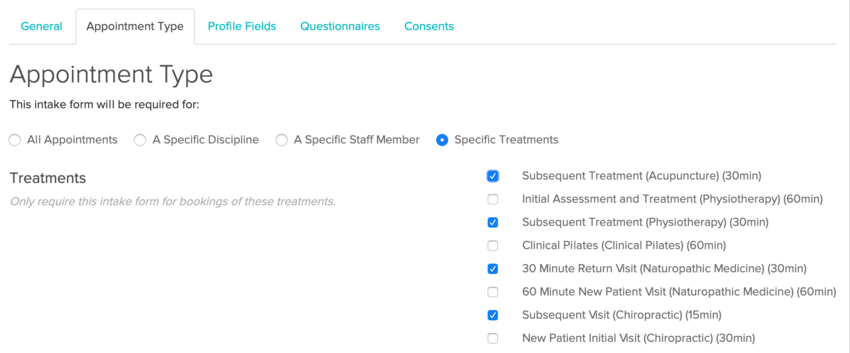If you’d like to have a form that is general to all clients for your clinic you can create an intake form that is sent to all clients on their first visit regardless of discipline. This could include a very basic questionnaire that is relevant to all of your disciplines, and could collect patient demographic information and include general office policy consents.