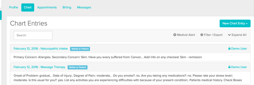Once submitted the intake forms are displayed in the patient’s chart: