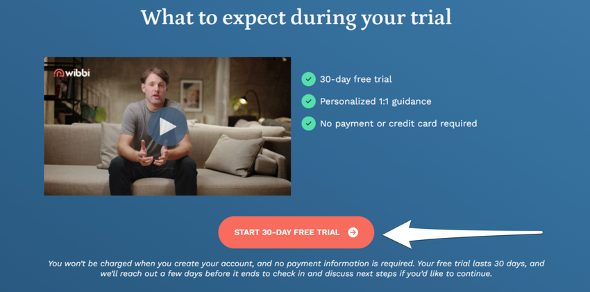 This brings you to the free trial section. During the Wibbi free trial, users receive full access to the platform for 30 days at no cost. No payment or credit card information is required to create an account, and users will not be charged at any time during the trial period.