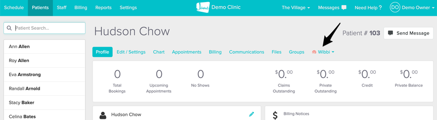 From your patient’s profile, click the Wibbi link. This will launch Wibbi in a new tab.