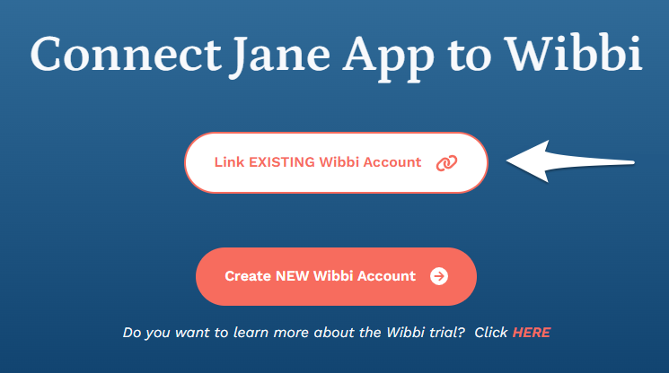 You’ll be redirected to the Wibbi landing page, where you’ll pick the Link EXISTING Wibbi account option.