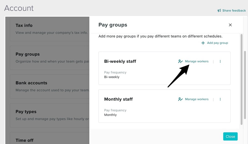 Select Manage workers next to the pay group you would like to add this staff member to.