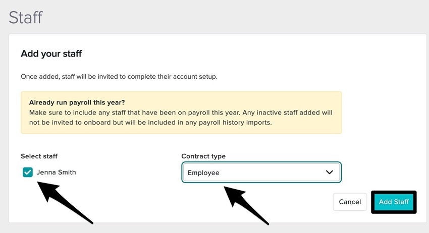 Click the checkbox next to the staff member you’re adding, choose their contract type and click Add Staff to save your changes.