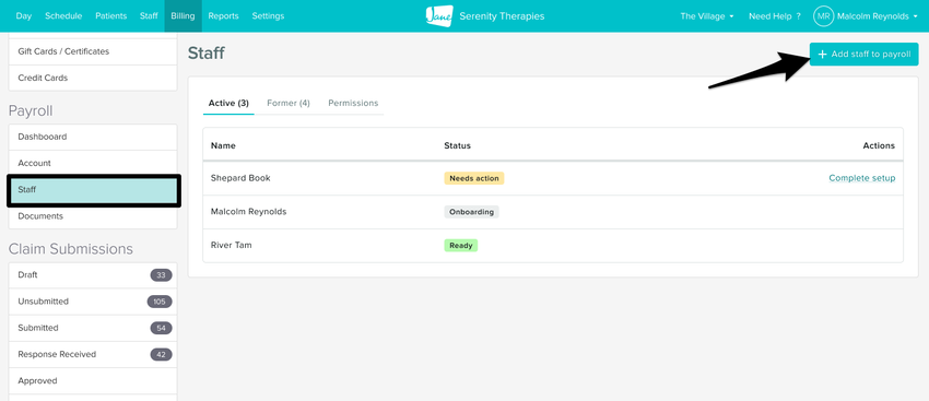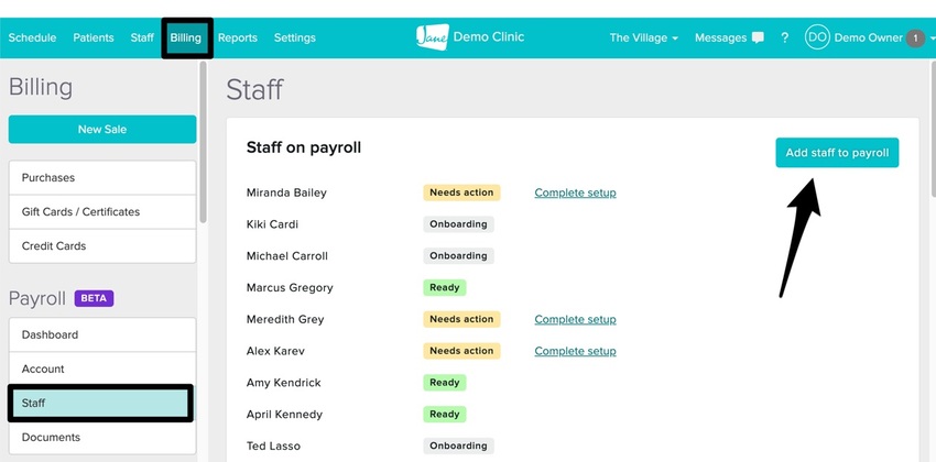 Last step! Head to Billing > Payroll > Staff and check that the staff member has a green Ready badge next to their name. All done!
