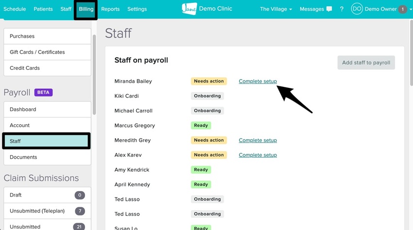 Once the staff member has finished entering their information in Step 3, the Account owner or Full Access user will head back to Billing > Payroll > Staff and click Complete Setup next to the staff member’s name.