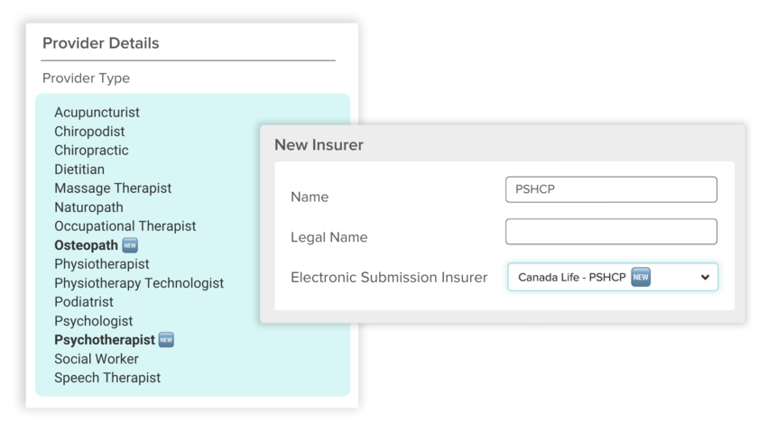 Practitioners can also start billing PSHCP… ASAP! To get started, Full Access Users can head into the insurer settings area (Settings > Insurers). Next, whether you’re creating a new insurer or upgrading an existing one, you can select “Canada Life - PSHCP” from the “Electronic Submission Insurer” dropdown.
