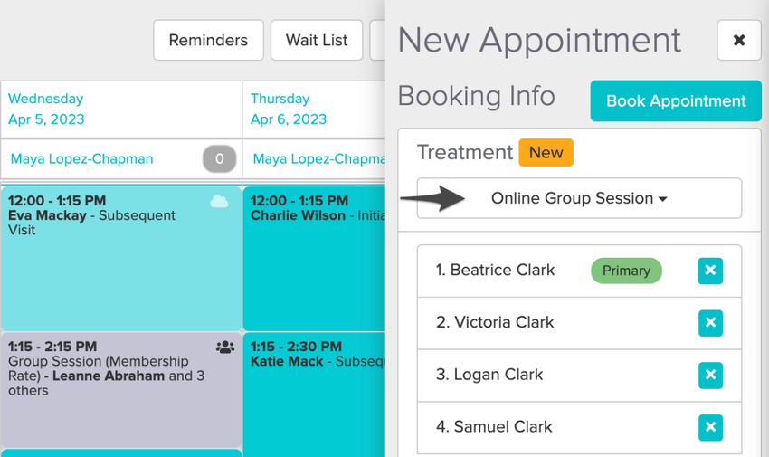 You can now book Group Appointments and Classes by clicking directly on the Schedule and choosing the appointment from the Treatment/Session drop-down on the Appointment panel!