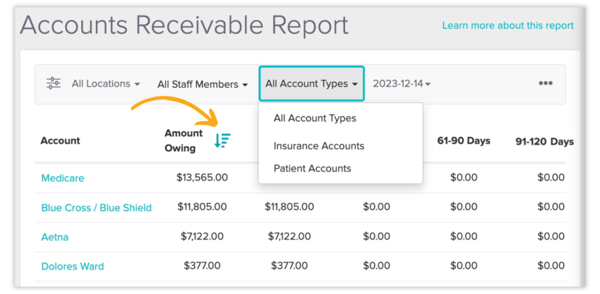 You can now filter the Accounts Receivable (A/R) Report by Insurer or Patient/Client Account. We’ve also added the ability to sort this report by Name, Amount Owing, and Age of the outstanding balance by clicking on the headings — helping you prioritize your outreach.