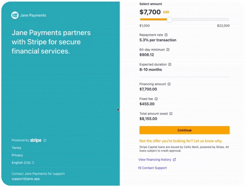 1 Clinic Financing by Stripe is only available in the United States. Stripe Capital offers financing types that include loans and merchant cash advances. All offers are subject to review prior to approval. In the U.S., loans are issued by Celtic Bank, and YouLend provides merchant cash advances. Jane does not determine eligibility or service these offers. See your Stripe Express Dashboard for personalized terms and conditions.