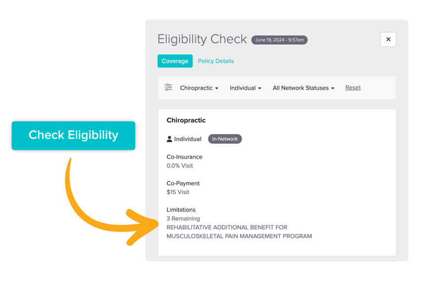 You can now head to your patient’s insurance policy in Jane (bonus: patients can share this info before their first appointment if you’re using the insurance collection field on your Intake Forms! 😉) and run an eligibility check in just a couple of clicks. Within seconds, you’ll see the results of the check — which you can easily filter to find what you need and refer back to in case you forget.